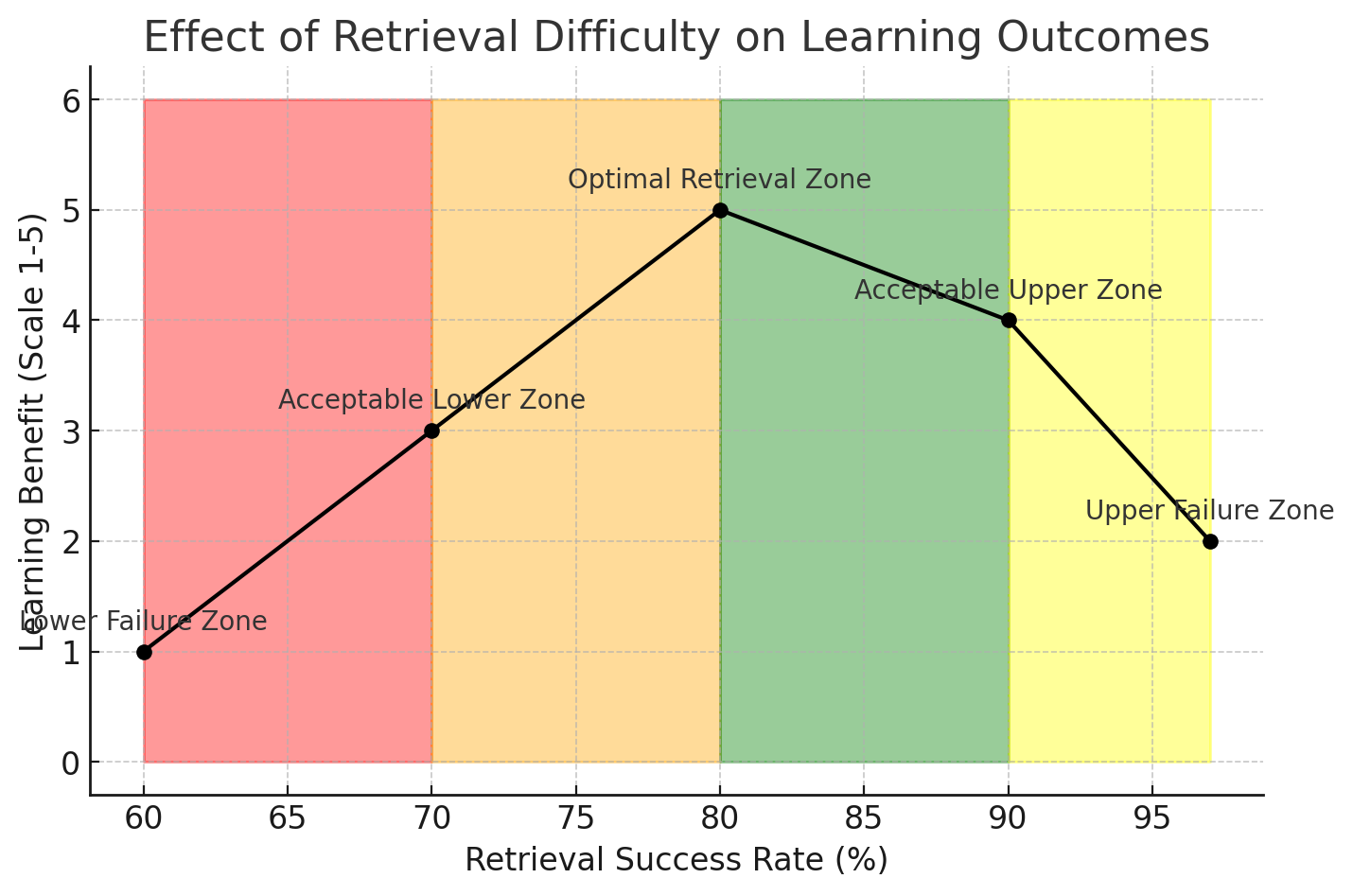 In Rowland's 2014 meta-analysis, the author found support for the idea that there's a relationship between initial test performance and the magnitude of the testing effect. Pyc and Rawson (2009) found that more challenging retrievals, provided they are successful, lead to better long-term retention compared to easier retrievals. They had participants learn Swahili-English word pairs and found that items retrieved with moderate difficulty (requiring some effort but successful retrieval) showed better long-term retention than items that were either too easy or too difficult to retrieve. Their findings suggested that there's an optimal level of retrieval difficulty that maximises learning. So we might consider the following zones for student success rate when engaging in retrieval practice:
