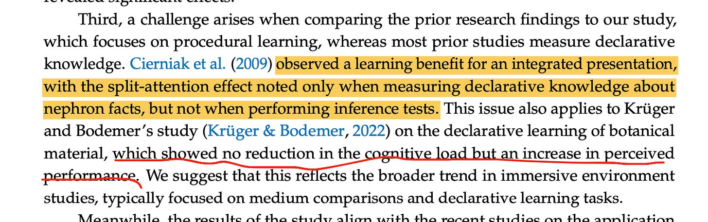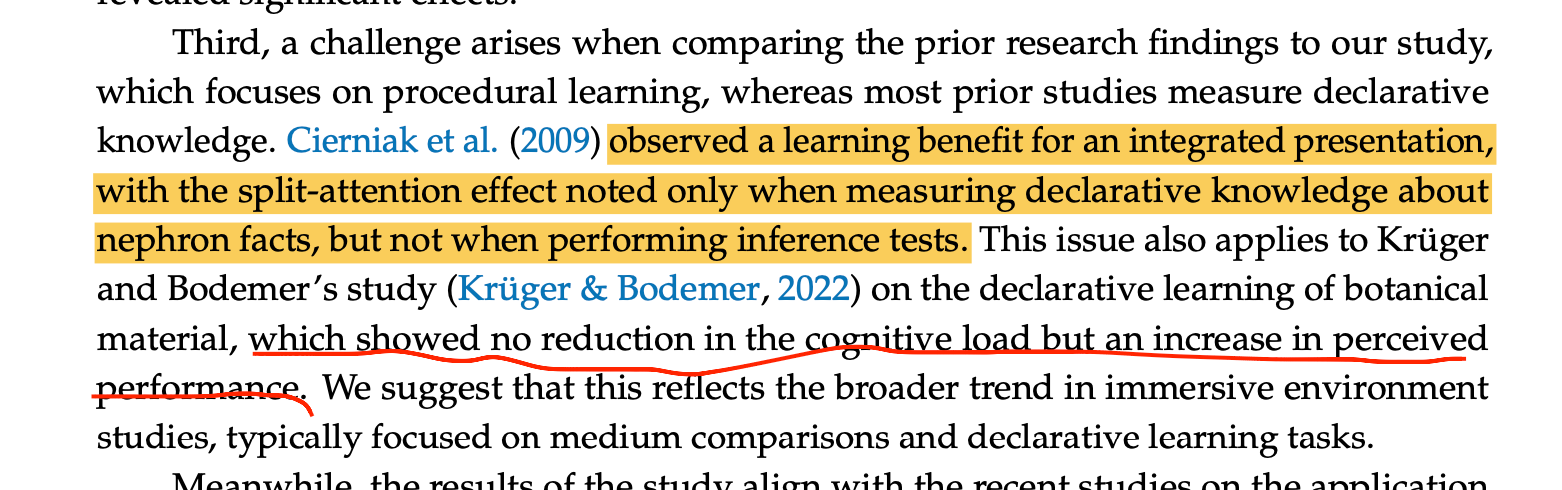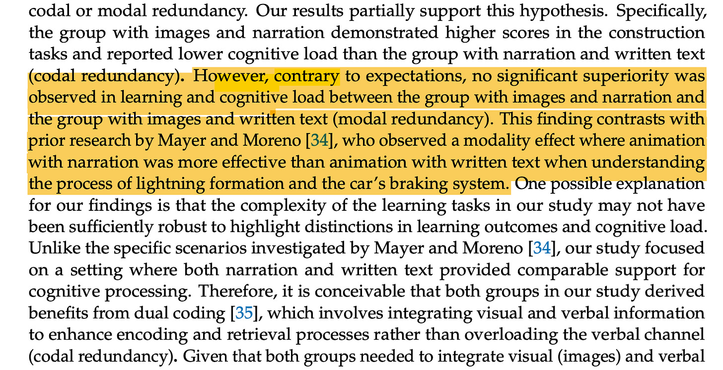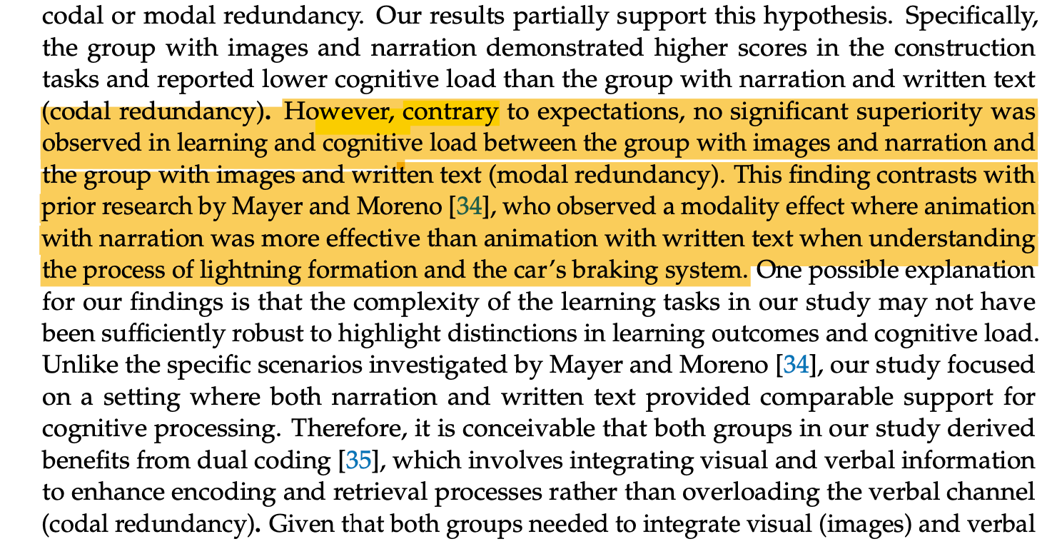 One aspect of this was kind of surprising: the study found no advantage for narration over written text when paired with images, contradicting Mayer and Moreno’s well-known modality effect (learning is enhanced when verbal information is presented in an auditory format such as spoken narration rather than as visual text when it accompanies related visual materials such as animations, diagrams, or pictures.) This suggests that in some contexts like tasks with lower complexity, both formats may engage cognitive processing similarly, blunting the expected CLT effects. The authors write: