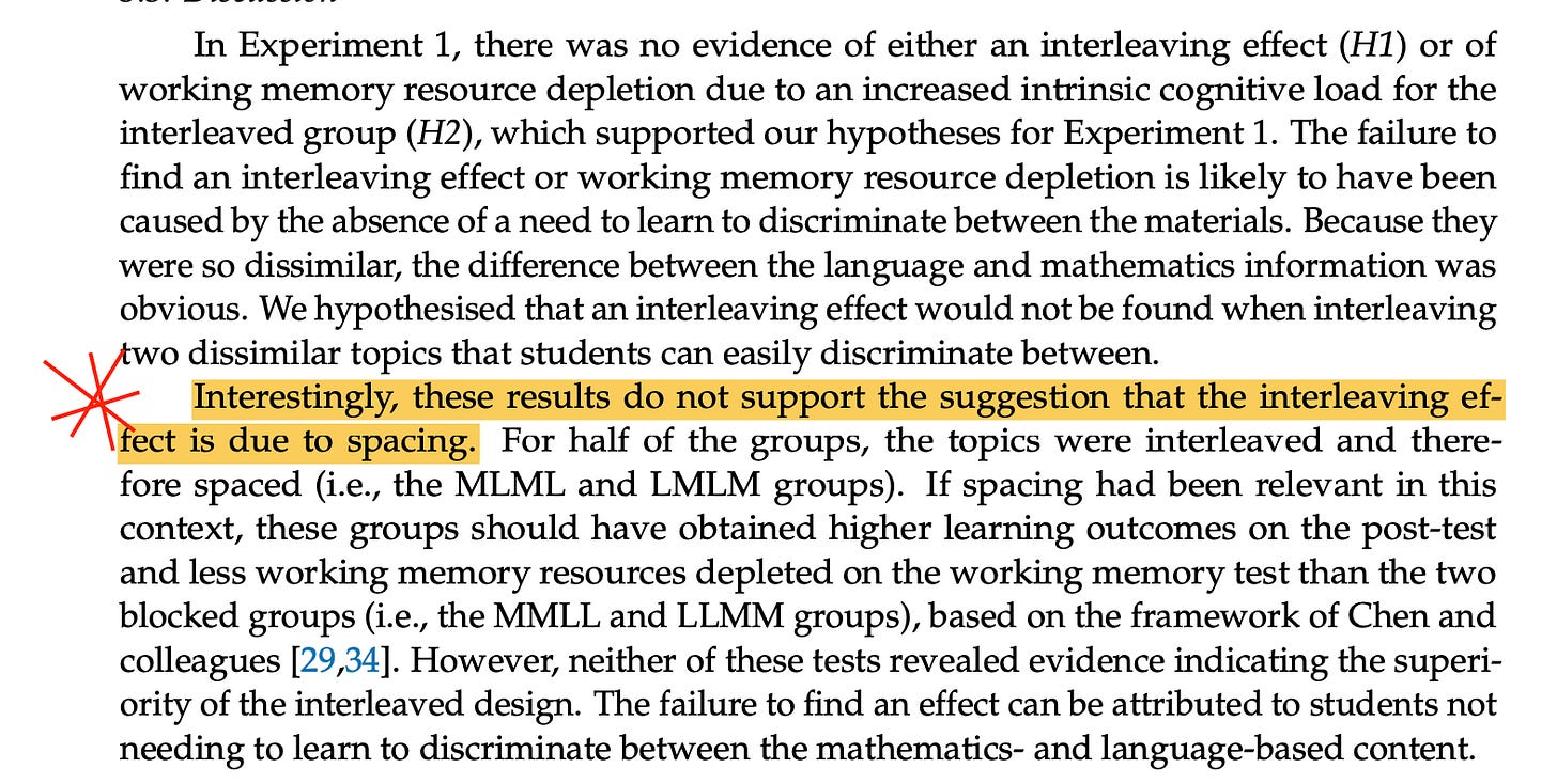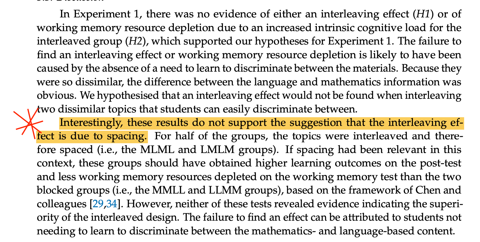 One thing I find very interesting here is an idea that seemed quite obvious to me - that the interleaving effect is linked to spacing but the authors here challenge that. See here: