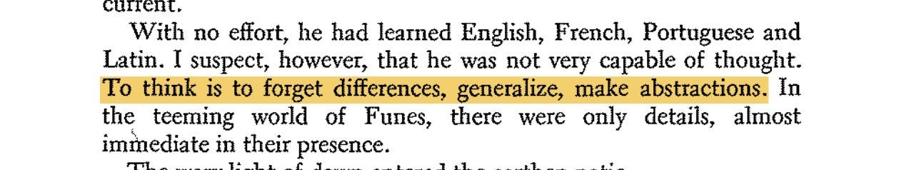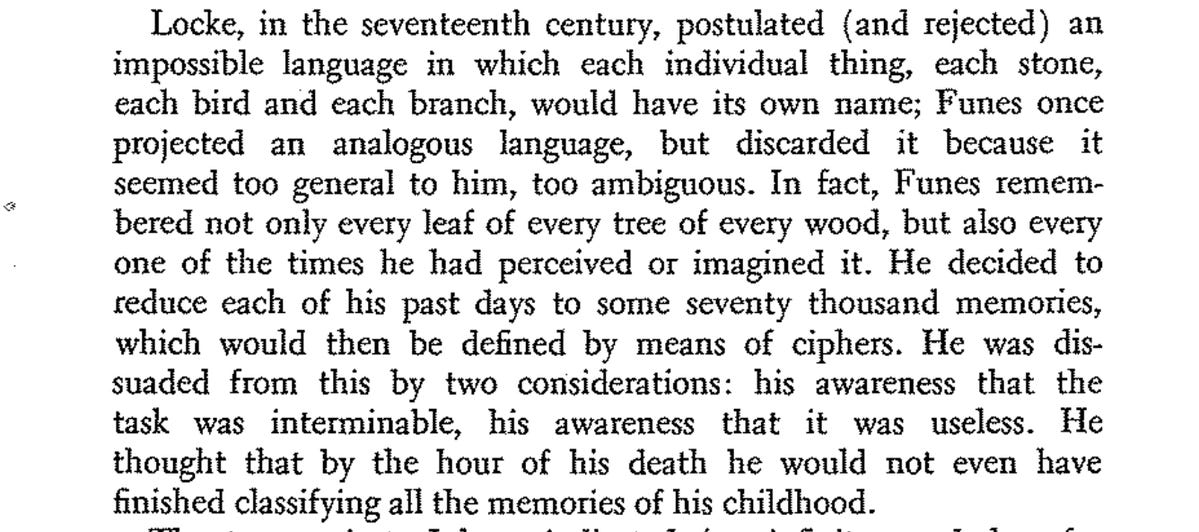 Borges plays with the idea of creating a language in which every single object and moment would have its own name, echoing Locke’s speculation about such an impossible system. But Funes abandons it when he realises that knowledge without forgetting is not knowledge at all, just an endless catalogue. To compare two things, two ideas, two experiences, we need them in some simplified form. If each is stored with every microscopic detail, there’s no way to align them, so they remain incomparable.
