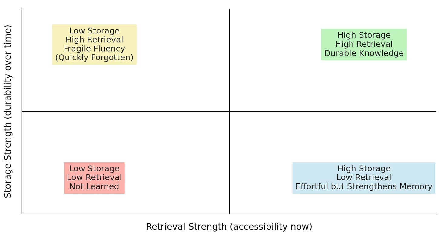 It also illustrates why rereading a page may feel fluent in the moment but produces only short-lived gains: it boosts retrieval strength briefly without adding much storage strength. In contrast, testing yourself on that same material, even if you fail at first, creates the conditions for storage strength to grow. Effort, not ease, is the signal of long-term learning.